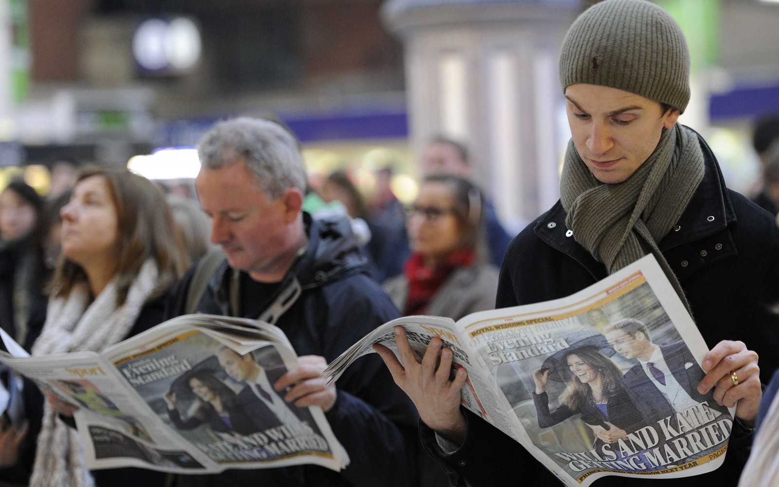 Commuters read copies of the Evening Standard newspaper, featuring a front page headline about the engagement of Britain’s Prince William to Kate Middleton, at Victoria rail station in London, November 16, 2010. Britain’s Prince William is to marry his long-term girlfriend Kate Middleton next year, after an on-off courtship lasting nearly a decade, bringing months of speculation about his intentions to an end. REUTERS/Paul Hackett (BRITAIN – Tags: ROYALS ENTERTAINMENT SOCIETY PROFILE) – RTXUPTX